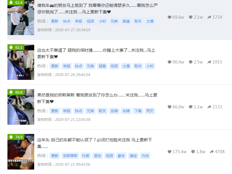 其中7月21日發(fā)布的第一個借車視頻獲贊175.5萬,同天發(fā)布的第二個視頻獲贊66萬。