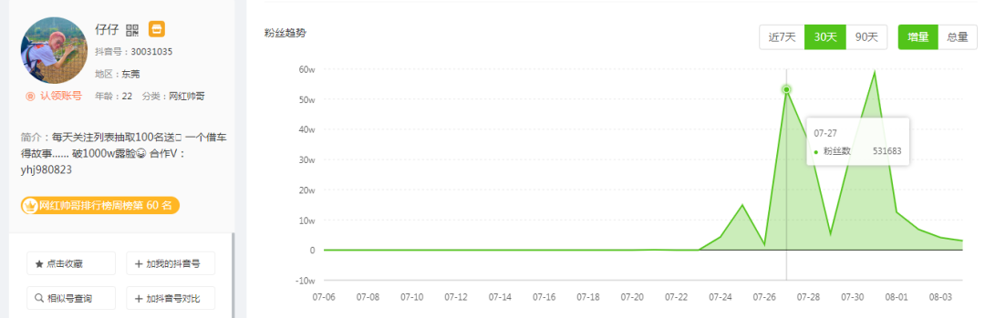 不過通過飛瓜數(shù)據(jù)分析得知,正式出現(xiàn)粉絲暴漲,是在7月27日(當天漲粉53萬),也就是借車連續(xù)劇的第4個視頻。
