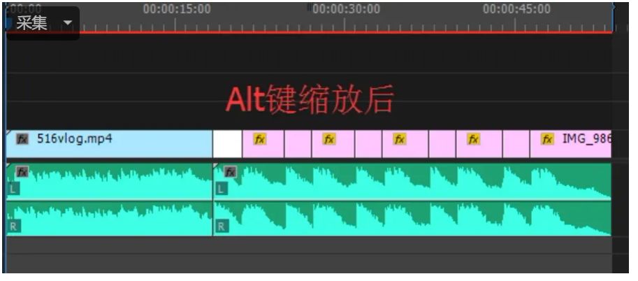 六、然后根據(jù)音頻的節(jié)奏來梳理圖片的長短,按住Alt轉(zhuǎn)動(dòng)鼠標(biāo)滑輪來縮放音頻素材,放大后的波峰波谷非常容易辨別。