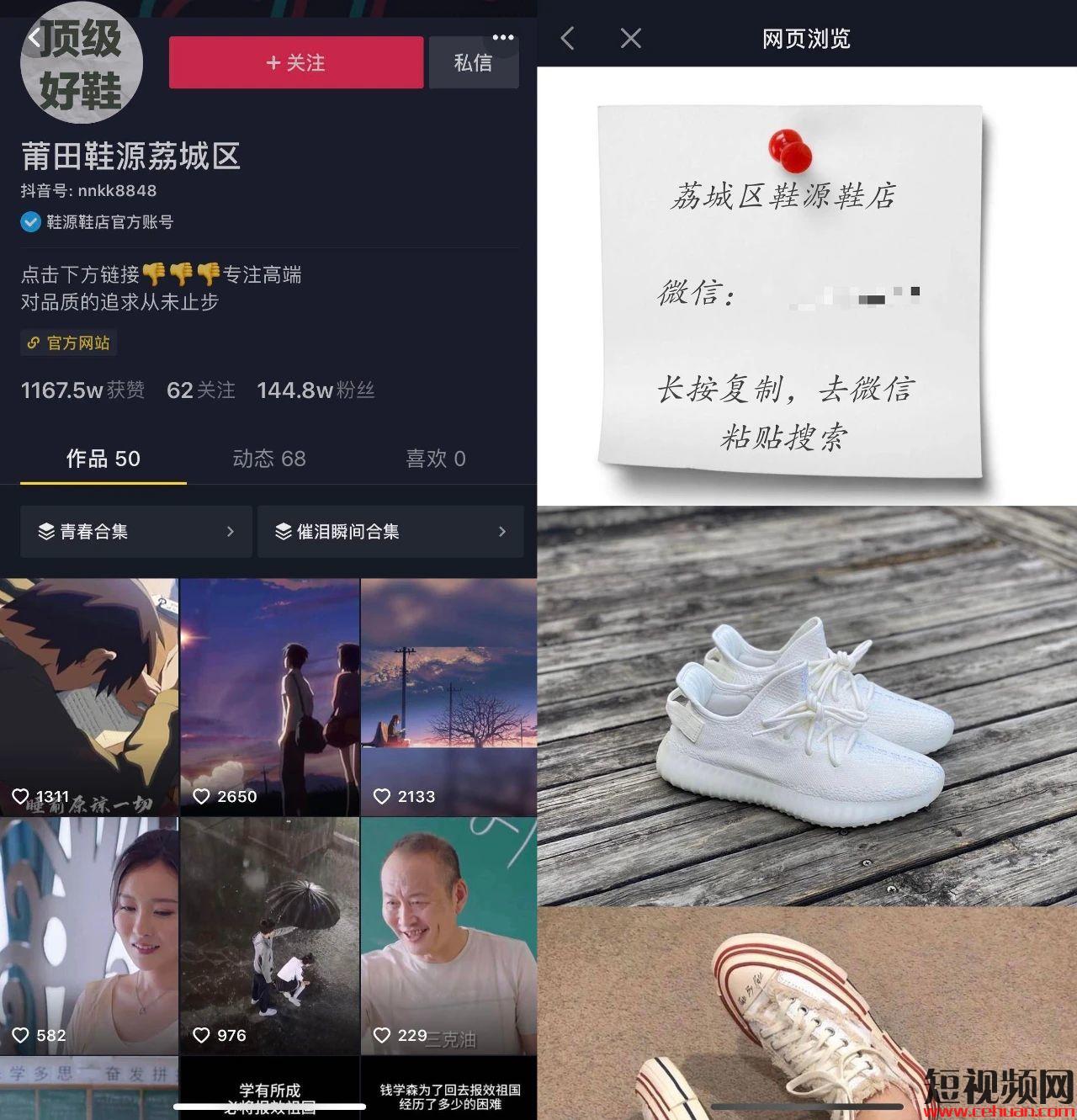 這些視頻流量不大,但阿西認為“夠了”:帶貨能力強就可以,營銷陣地變了,不變的是,高仿潮鞋灰色鏈條中,福建莆田還是最有優(yōu)勢。仿鞋作坊會買正版鞋拆開研究,一比一仿造,他這樣的“中間商”則通過招募下線的代發(fā)模式從中賺取差價。 當(dāng)然,引流也有一定的技巧,抖音上一位名叫“莆田鞋源荔城區(qū)”的博主通過發(fā)布劇情類、熱門BGM等視頻內(nèi)容,至今已經(jīng)收獲了140萬粉絲。這位博主是借主頁鏈接中的微信號引流。