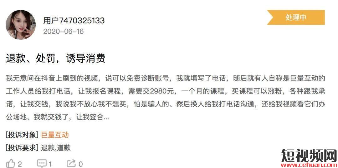 與抖音培訓相關的投訴 來源 / 黑貓投訴而其中,多位用戶的投訴都指向了前文提到的“巨量互動”公司。 這家公司全稱是福建省巨量互動互聯(lián)網(wǎng)產(chǎn)業(yè)有限公司。據(jù)天眼查顯示,巨量互動是這家公司正在申請注冊的商標,于2020年4月23日發(fā)起認證,至今仍處于等待實質審查的狀態(tài)。
