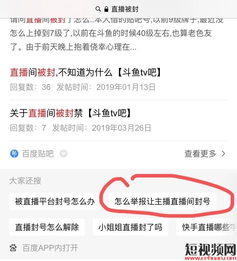 更讓人細(xì)思極恐的是,在百度搜索“直播被封”,相關(guān)搜索里赫然有一條“怎么舉報(bào)讓主播直播間封號(hào)”。