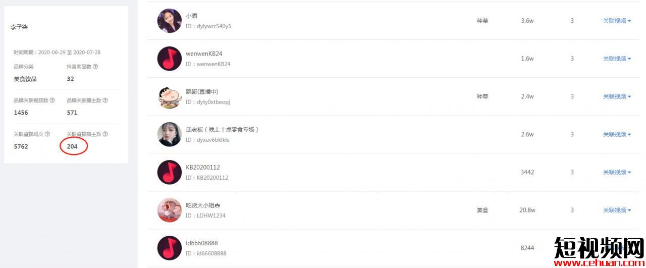 現(xiàn)在很多商家可以開始鋪量帶貨,也就是尋找多個咖位較小的帶貨型主播 ,在抖音形成矩陣,不僅讓更多的人在同一時間發(fā)現(xiàn)多次看到這個產(chǎn)品從而記住產(chǎn)品 ,而且還在一定程度上保證了銷售量 。例如李子柒品牌美食,在最近一個月關(guān)聯(lián)播主就已達(dá)到200+。 (圖片來自飛瓜數(shù)據(jù))