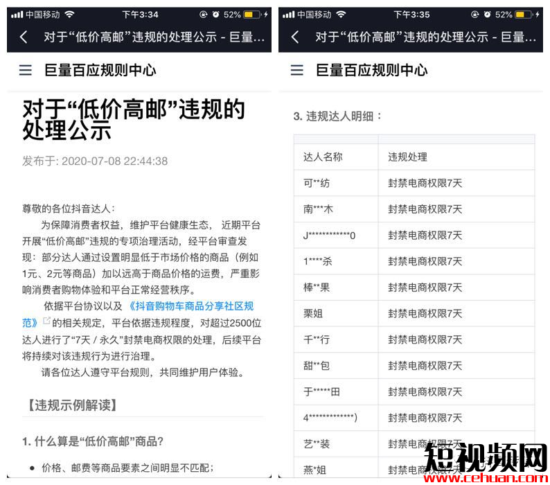 7月8日,抖音也特別發(fā)布了對低價高郵違規(guī)賬號的處理公示: