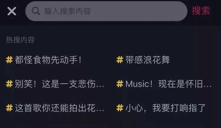 在抖音的搜索框下,有一個“熱搜內(nèi)容”,這個內(nèi)容是不是用戶熱搜的不知道,但一定是官方花了精力在運營的,因為他的位置非常關(guān)鍵。