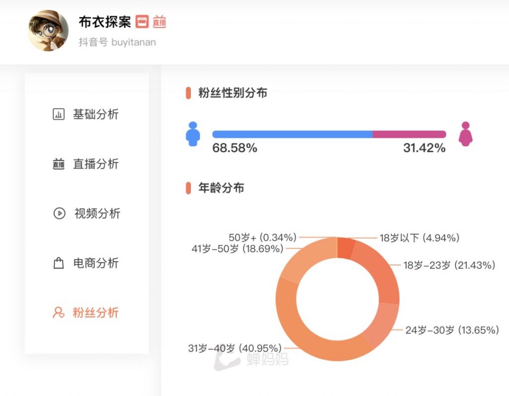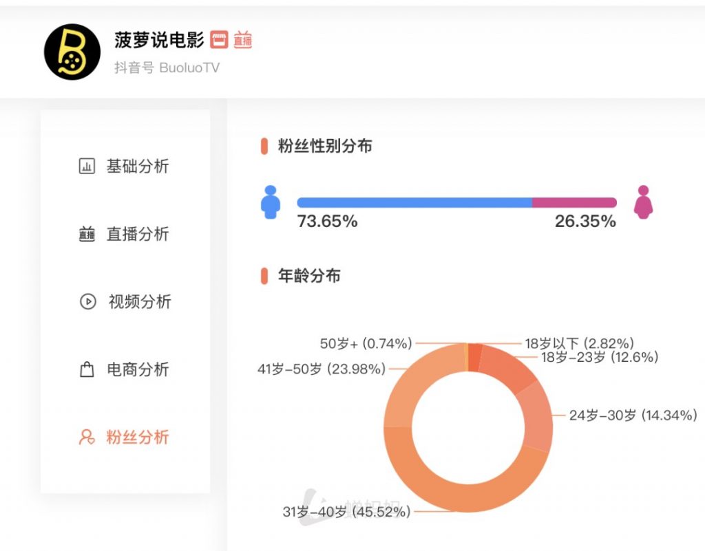 幾乎類(lèi)似的粉絲群體也在其他影視號(hào)里出現(xiàn),布衣探案和菠蘿說(shuō)電影兩個(gè)賬號(hào)的男性粉絲占比也在70%左右,年齡層分布于18-40歲之間。