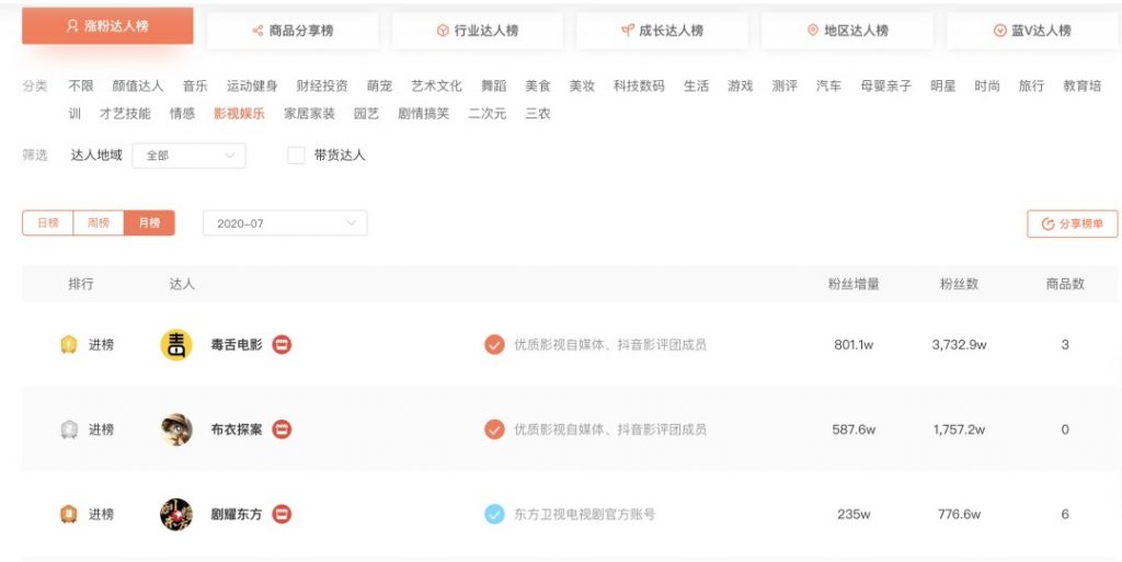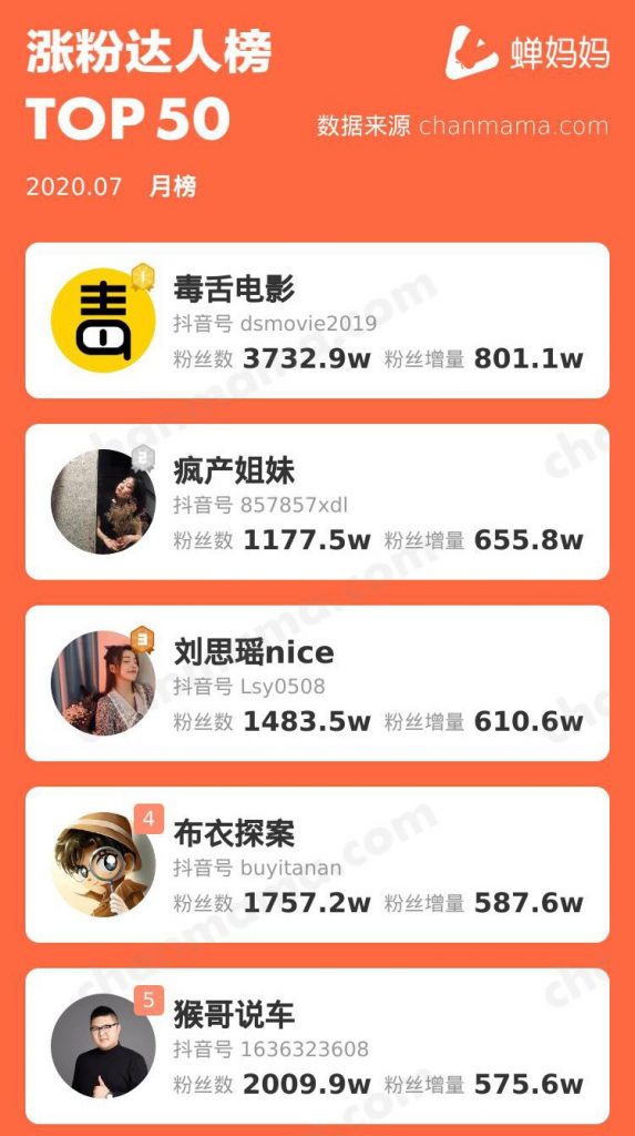 7月份的抖音漲粉榜已經(jīng)出爐,漲粉達(dá)人榜的第一名依然是毒舌電影,毒舌電影已經(jīng)連續(xù)3個(gè)月蟬聯(lián)漲粉達(dá)人榜的第一。