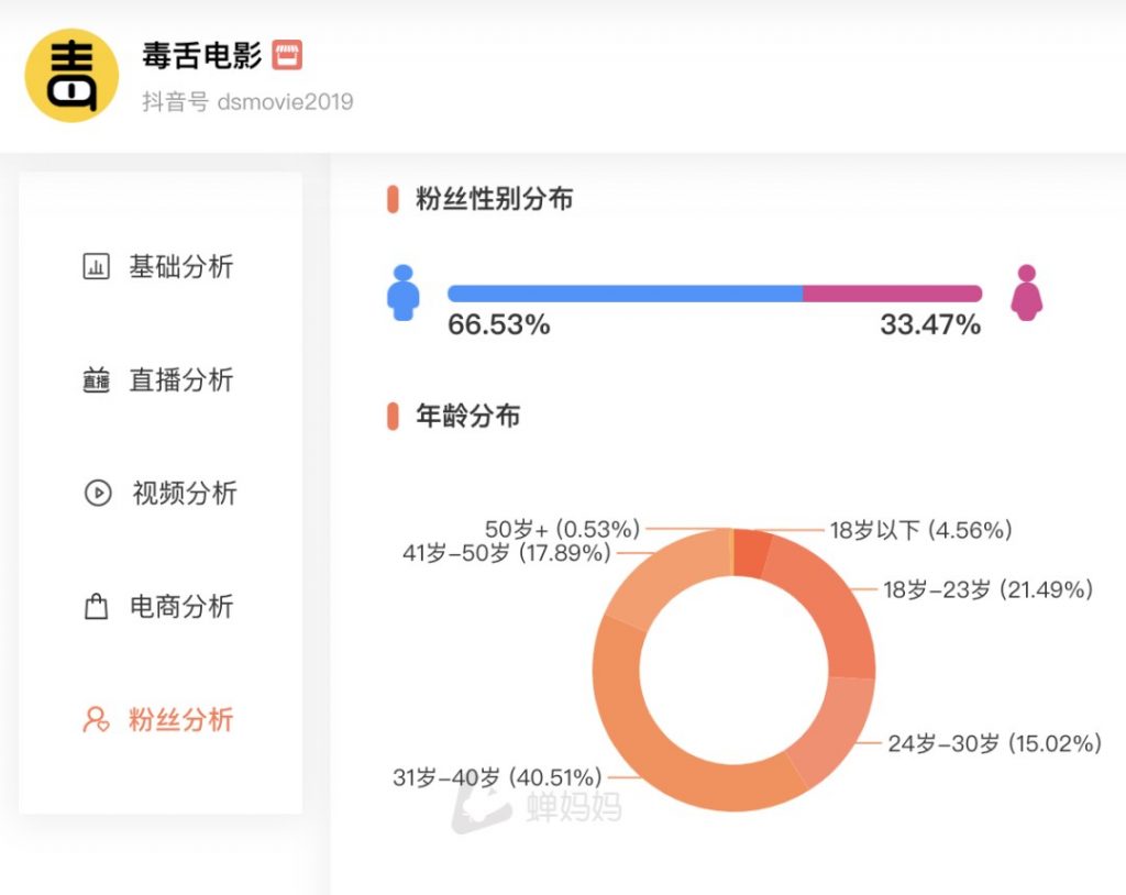 蟬媽媽數(shù)據(jù)分析發(fā)現(xiàn),毒舌電影的粉絲群體中男性粉絲占比較高達(dá)到66.53%,年齡層主要分布在18-40歲。