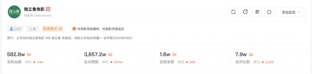 此外,還有大批是公眾號(hào)轉(zhuǎn)入抖音的影視號(hào),例如:獨(dú)立魚(yú)電影,是影視類(lèi)公眾號(hào)的佼佼者,分類(lèi)排行榜前十的???。轉(zhuǎn)戰(zhàn)抖音后,獲得了508萬(wàn)粉絲。