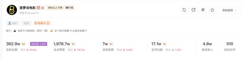 而分類(lèi)排名第五的菠蘿說(shuō)電影從4月16日才發(fā)布了第一期視頻,僅4個(gè)月的時(shí)間,粉絲數(shù)已經(jīng)達(dá)到了360萬(wàn),并且7月份單月漲粉超過(guò)200萬(wàn)。