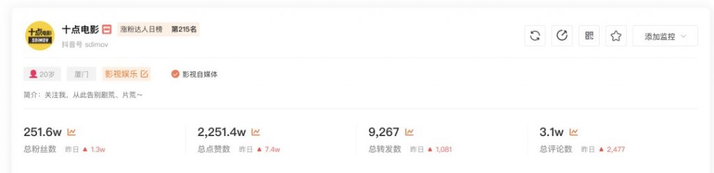 另外,十點(diǎn)電影也是影視公眾號(hào)領(lǐng)域的頭部賬號(hào),進(jìn)入抖音之后收獲粉絲250萬(wàn),點(diǎn)贊數(shù)達(dá)到2250萬(wàn)。