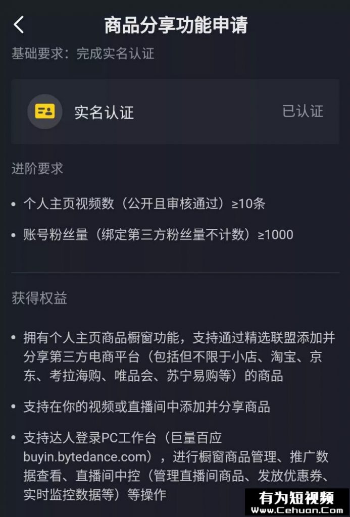 同時滿足以上三個條件后,就可以直接申請開通商品分享權(quán)限,進(jìn)行抖音短視頻帶貨了。
