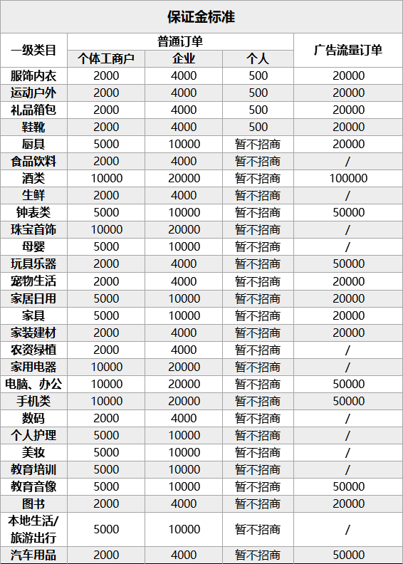 根據(jù)你選擇的類目不同,所需要繳納的保證金費(fèi)用也不一樣,如下圖為抖音小店保證金詳情: