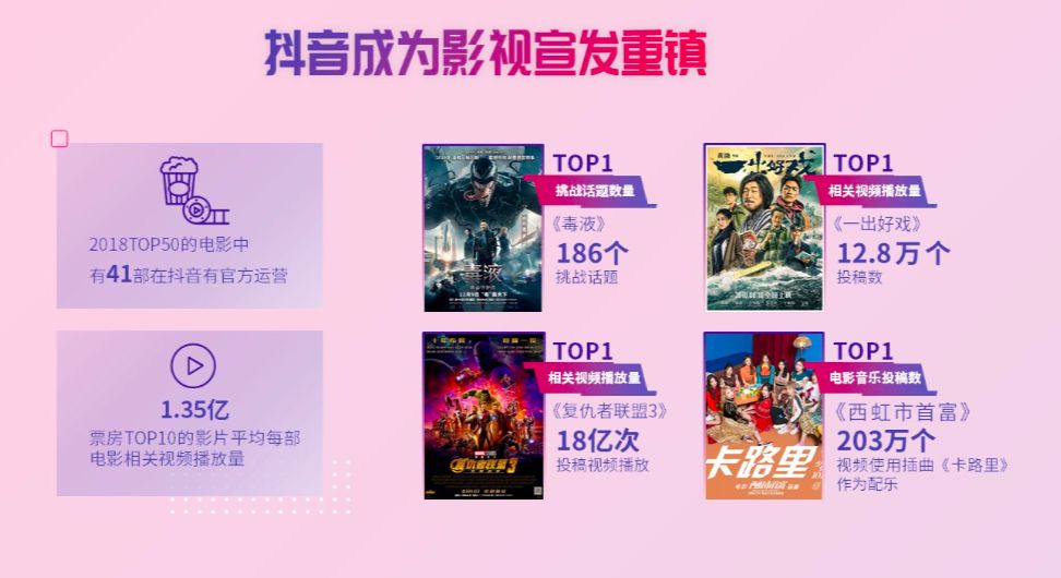 抖音官方的數(shù)據(jù)顯示,在電影領(lǐng)域,2018年Top 50的電影中有41部在抖音有官方運營。其中,票房前十位的影片平均每部電影在抖音相關(guān)視頻的播放量超過1.35億。