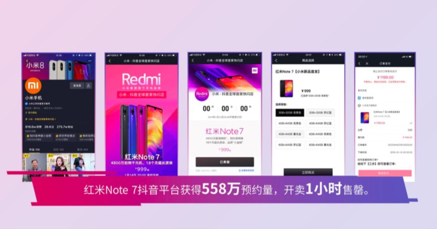 從刷到一個有趣的豎版視頻,再到點擊鏈接瞬間進入一個豎版的預約頁面,通過點擊可直達快閃店頁面,迅速get產(chǎn)品信息并完成一站式購買,整個通路流暢無阻,大大縮短購買決策路徑。最終,紅米Redmi Note 7在抖音獲得了558萬的預約量。