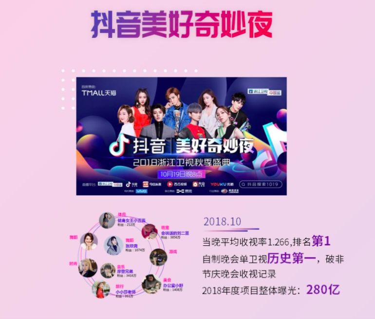 2018年10月19日晚上,抖音聯(lián)合浙江衛(wèi)視舉辦了《抖音美好奇妙夜》,當晚平均收視率是1.26,排名第一,最高的收視率達到1.8,創(chuàng)了自制晚會的收視第一名,線上同步直播,整個晚會的曝光超過280億。