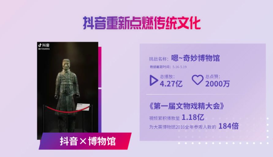 在文化方面,抖音的#嗯,奇妙博物館#短短3天的播放量超過4.27億,而《第一屆文物戲精大會》的總體播放量達到1.18億,是大英博物館2016年全年參觀人數(shù)的184倍。