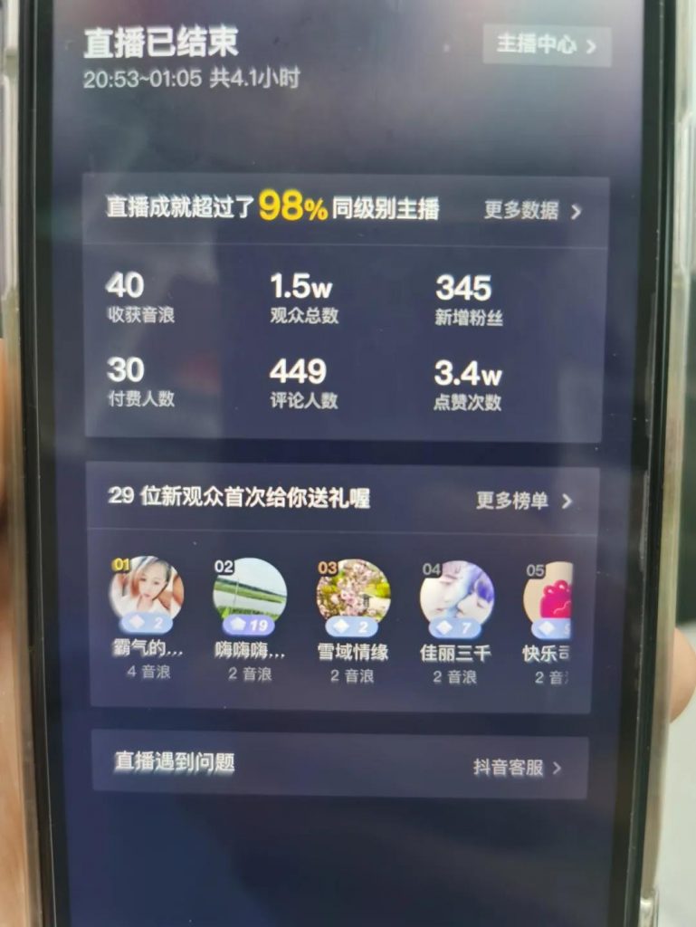 這個數(shù)據(jù)其實在你的直播后臺就可以看到,他們分別是:收獲音浪、觀眾總數(shù)、新增粉絲、付費人數(shù)、評論人數(shù)和點贊次數(shù)。