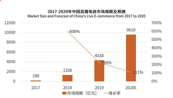 從行業(yè)方面來(lái)看,根據(jù)iiMedia數(shù)據(jù)顯示,國(guó)內(nèi)直播電商市場(chǎng)規(guī)模從2017年的190億元迅速增長(zhǎng)至2019年的4338億元,預(yù)計(jì)2020年規(guī)模將達(dá)9610億元,同比增長(zhǎng)122%。