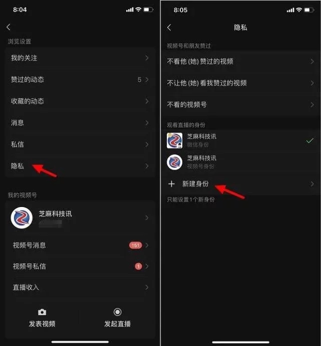 2、在接下來(lái)的界面中,點(diǎn)擊隱私 -> 新建身份,默認(rèn)包含微信身份和視頻號(hào)身份,這兩個(gè)都是不能修改的,但用戶可以自定義設(shè)置一個(gè)新身份,也就是小號(hào),如圖所示。