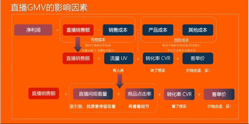 說到GMV,真的是大家真正關(guān)心的嗎?作為商家來說更關(guān)心的其實是凈利潤。我們都知道,直播間的凈利潤=直播銷售額-銷售成本-產(chǎn)品成本-其他成本。其中前兩項是可控的成本,這取決于商家在平臺的流量運維和流量購買能力,而后兩項是固定成本,取決于商家的供應(yīng)鏈/研發(fā)能力平臺無法提供改善支持。