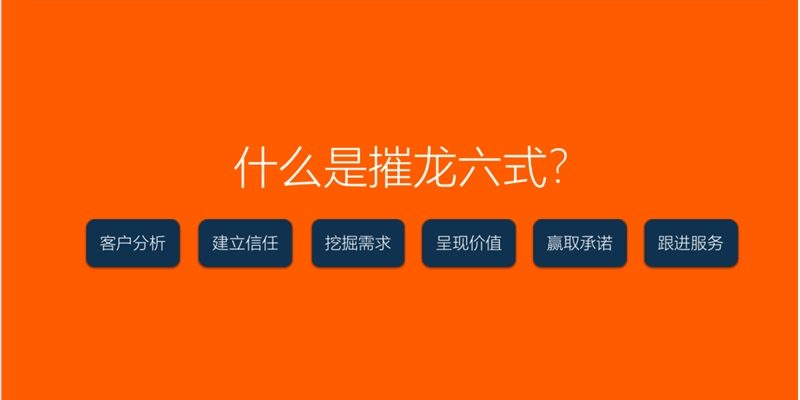 這個課題一發(fā)出去有很多人來問,什么是“摧龍六式”?聽著像是一個很厲害的武功秘籍。其實“摧龍六式”說的是銷售六個步驟。分別是:客戶分析、建立信任、挖掘需求、呈現(xiàn)價值、贏取承諾、跟進服務(wù)。