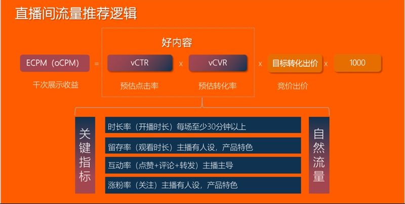 我們通過一個競價廣告排序的公式來看看直播間流量的推薦邏輯,ECPM是平臺評估榜商家展示一千次能給自己帶來多少收益的公式,計算出來的數(shù)據(jù)越大,你的廣告就越有機會曝光。