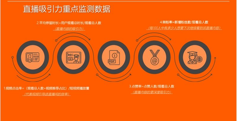 直播間的吸引力程度可以通過這些數(shù)據(jù)來看,視頻的點擊率說明視頻引導(dǎo)的效率。平均停留時長是用戶觀看總時長除以觀看總?cè)藬?shù)。停留時長越長說明你的直播間越有吸引力,通常平均停留時長:<1分鐘不及格,1-2分鐘及格,2-3分鐘良好,≥3分鐘優(yōu)秀。點贊率說明直播內(nèi)容有更深度的吸引力。轉(zhuǎn)粉率通常說明這些人愿意看你的下一次直播。