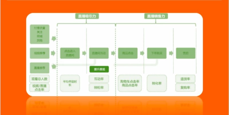 我把直播間停留時長、互動、轉(zhuǎn)粉表現(xiàn),歸類為直播間的吸引力;商品點擊、購買售后表現(xiàn)成為直播間的銷售力。