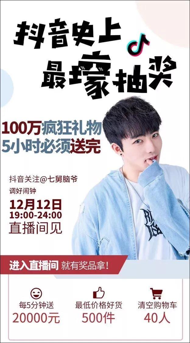 12月12日,就在抖音全面開通購物車自助申請功能的當(dāng)天,「七舅腦爺」隆重地舉辦了個人直播電商活動。洋蔥集團(tuán)告訴曾美老師,為了腦爺慶祝全網(wǎng)粉絲破6000萬與回饋粉絲,這次活動跟贊助商談到了價值100萬的獎品,全部通過抽獎的方式贈送給粉絲,并選擇40位粉絲幫他們清空購物車,金額上不封頂。