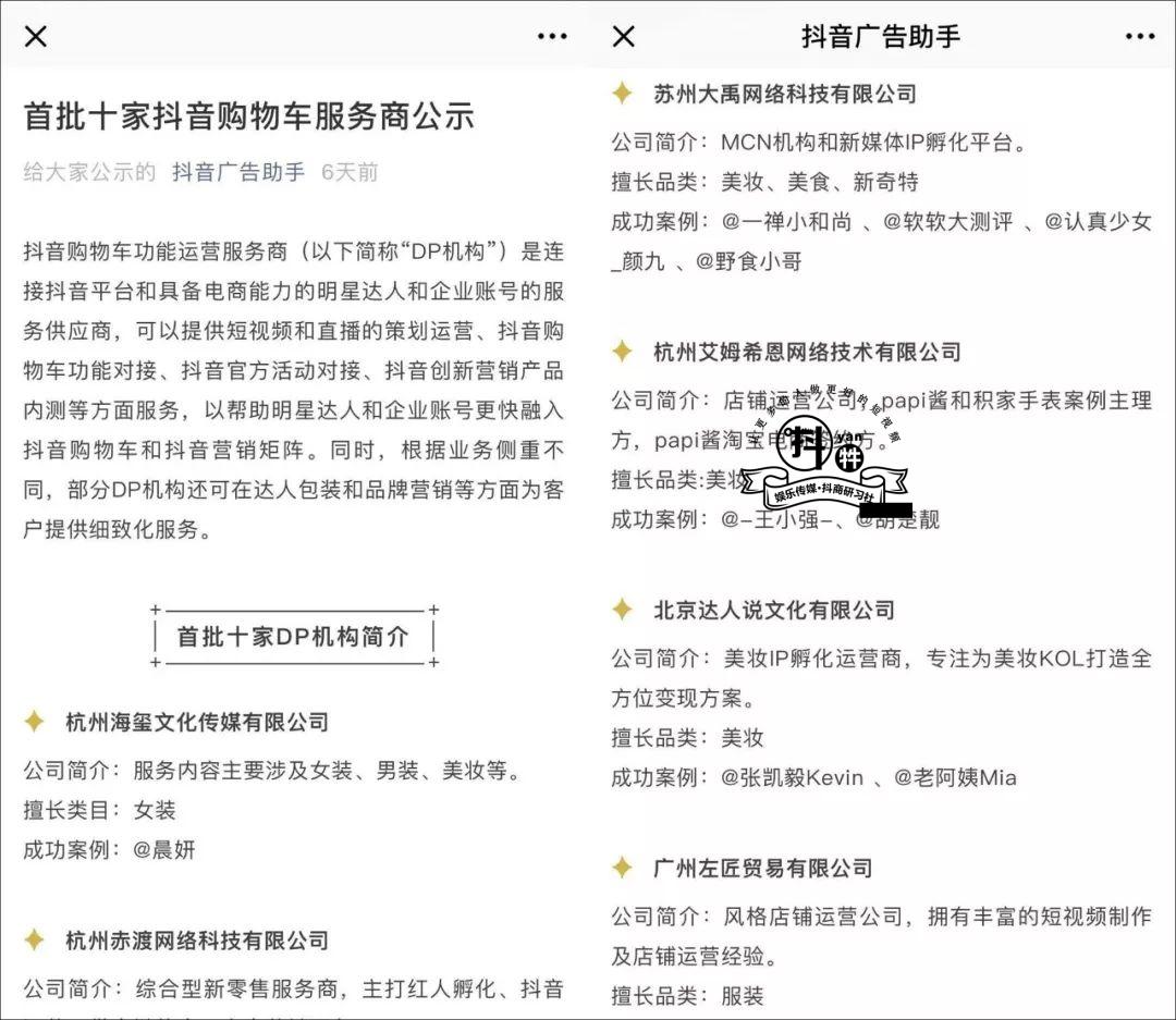 也有部分內(nèi)容公司與MCN機(jī)構(gòu)已經(jīng)搭建起了專業(yè)的供應(yīng)鏈,日前抖音公示的首批十家購物車服務(wù)商中,有4家都是IP孵化、運(yùn)營公司,包括「一禪小和尚」、「野食小哥」的持有機(jī)構(gòu)大禹網(wǎng)絡(luò)、「張凱毅Kevin」的持有機(jī)構(gòu)達(dá)人說。它們將作為獨(dú)立于開通直通車的明星達(dá)人和企業(yè)賬號外的第三方服務(wù)商,為雙方提供策劃、對接和內(nèi)測等輔助性工作。