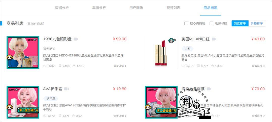 ▲  「認(rèn)真少女_顏九」商品櫥窗數(shù)據(jù)  來源:卡思商業(yè)版