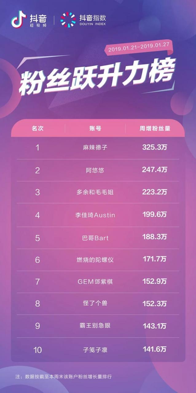 本周家庭廚師@麻辣德子重新回到躍升力榜首,對(duì)了@德子哥,年夜飯吃點(diǎn)啥呢?與上周相同,另外一位集才華和顏值于一身的女子@阿悠悠 躥升至榜單第二名,她憑借出色的唱功,在一周內(nèi)迅速吸粉247萬(wàn)。再來(lái)看看榜單上的新面孔,外國(guó)翻唱高手@巴哥Bart 、搞笑偶像劇@霸王別急眼 也憑實(shí)力入圍前十,新的一年抖音君也期待更多新人能在抖音上收獲更多粉絲與認(rèn)可。