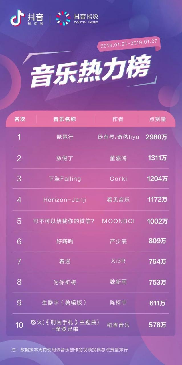 本周《琵琶行》依舊以2980w的點(diǎn)贊量占據(jù)音樂(lè)熱力榜,2018年,不少歌曲通過(guò)抖音傳遍了大江南北,今年過(guò)年不妨一起來(lái)聽(tīng)聽(tīng)蔡依林與抖音達(dá)人們演唱的歌曲——《新年抖來(lái)咪》三分鐘的mv重新串聯(lián)2018年抖音熱門(mén)歌曲,一起攜手開(kāi)啟2019抖音美好音符年!戳下面看視頻!