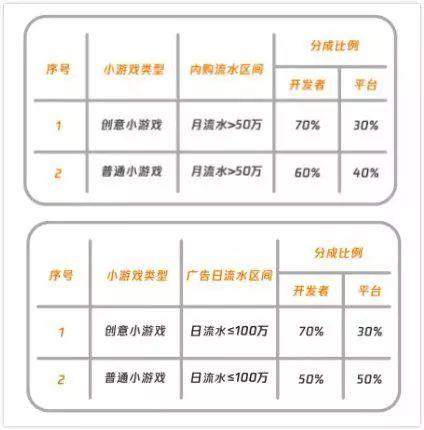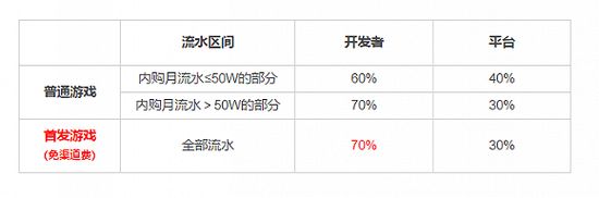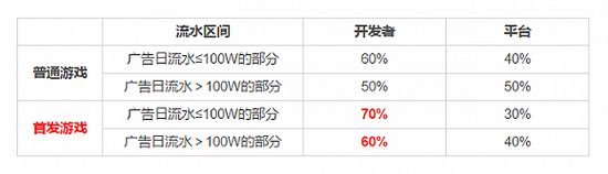 除了渠道費(fèi)外,首發(fā)游戲在廣告和內(nèi)購兩項(xiàng)收入上也享有一定的分成優(yōu)惠。據(jù)介紹,普通游戲廣告日流水收入不高于100萬的部分,開發(fā)者的分成比例是60%;超過100萬的部分,開發(fā)者和平臺(tái)對半分。首發(fā)游戲則享有10%的分成優(yōu)惠。
