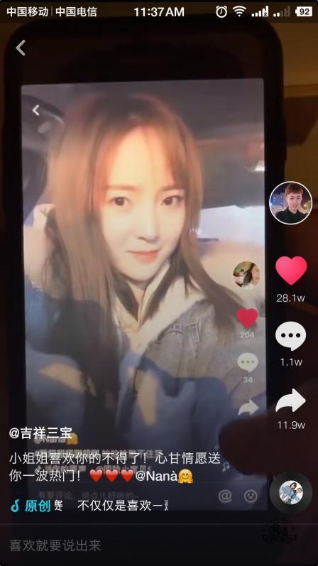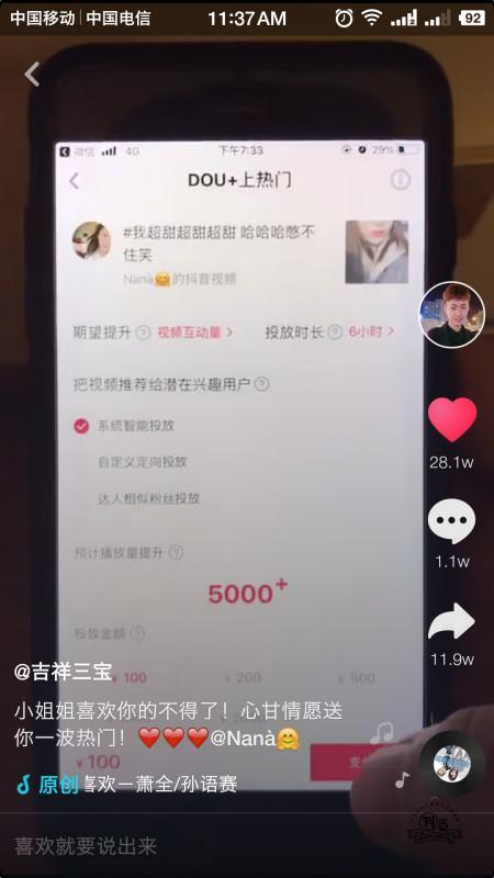 最近,一位抖音用戶@吉祥三寶 十分喜愛一位抖音上的小姐姐@NaNa,于是通過抖音DOU+上熱門功能心甘情愿送了這位小姐姐一波熱門,沒想到這位粉絲和他的偶像一起火了!
