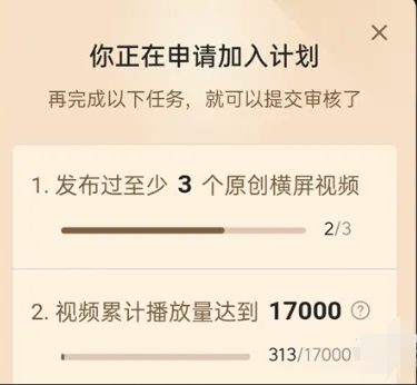2、發(fā)布至少3個(gè)原創(chuàng)橫屏視頻。視頻累計(jì)播放量達(dá)到17000次以上。