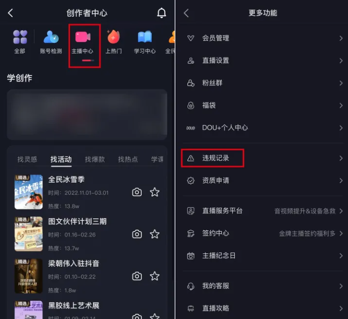 要查看直播過程中產(chǎn)生的所有違規(guī)記錄和扣分情況,您可以打開抖音進入【我的】界面,點擊【列表】的圖標,在顯示的側(cè)邊欄中找到并點擊【創(chuàng)作者服務(wù)中心】。在該界面里,點擊【主播中心】——【違規(guī)記錄】,即可查看所有違規(guī)記錄和扣分情況。