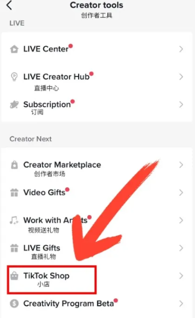 在創(chuàng)作者工具界面中,點(diǎn)擊“TikTok Shop”。