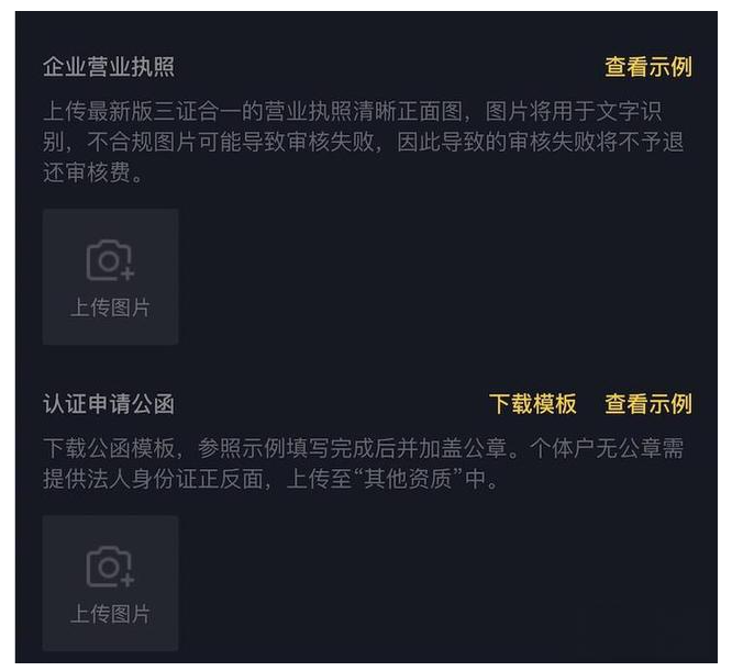 2)上傳——企業(yè)營業(yè)執(zhí)照、認(rèn)證申請公函(蓋公章),個體戶無公章需提供法人身份證正、反面
