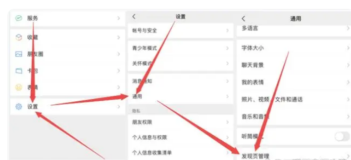 1、微信點(diǎn)擊右下角“我”,點(diǎn)擊“設(shè)置”,再點(diǎn)擊“通用”,然后點(diǎn)擊“發(fā)現(xiàn)頁(yè)管理”。
