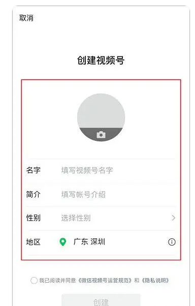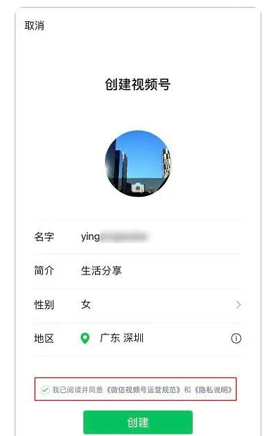 第五步:填寫完信息后,勾選【我已閱讀并同意《微信視頻號(hào)運(yùn)營(yíng)規(guī)范》和《隱私說(shuō)明》,并點(diǎn)擊【創(chuàng)建】