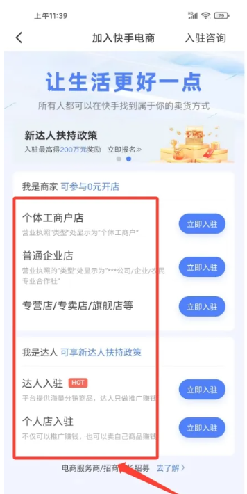 4、進(jìn)入加入快手電商,選擇入駐類型。