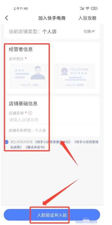 5、進(jìn)入個(gè)人入駐,上傳經(jīng)營(yíng)者信息、店鋪信息,點(diǎn)擊“人臉驗(yàn)證并入駐”。