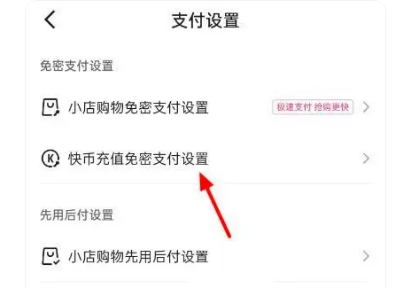 3、在支付設置頁面中,找到“快幣充值免密支付設置”選項,點擊進入。