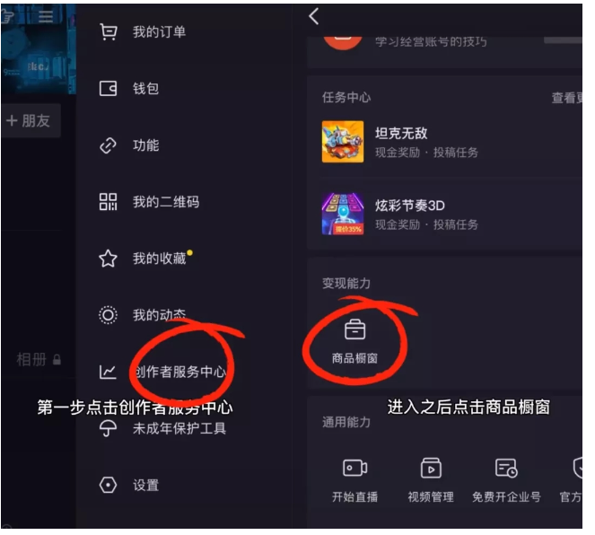 4、在創(chuàng)作者服務(wù)中心頁面,選擇“商品櫥窗”功能;