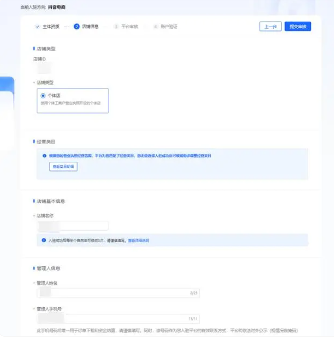 然后填寫店鋪名稱、管理人信息,包括姓名和手機號。