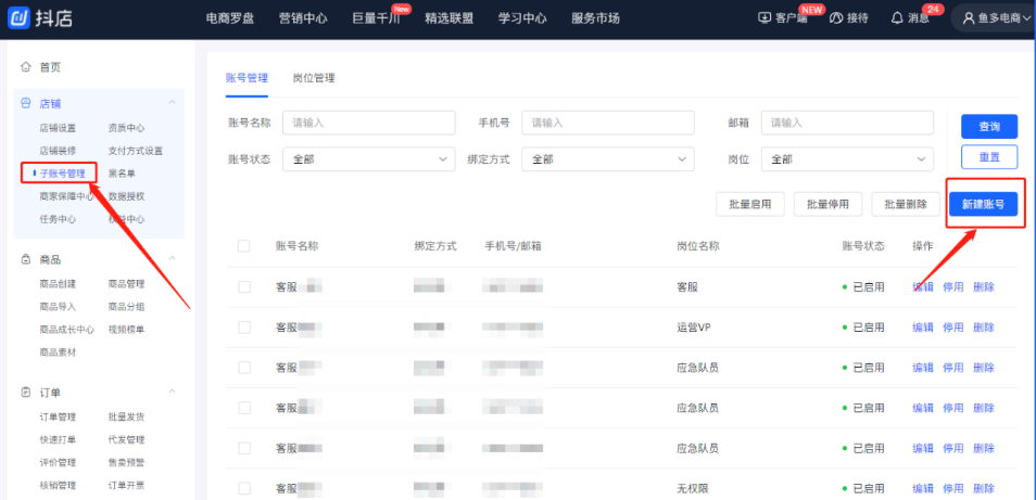 1. 使用主賬號(hào)登陸【商家后臺(tái)】-點(diǎn)擊【店鋪】-點(diǎn)擊【子賬號(hào)管理】-在【賬號(hào)管理】頁面,點(diǎn)擊【新建賬號(hào)】;