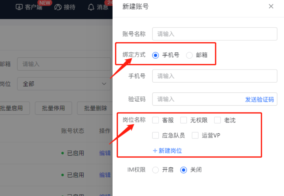 2.子賬號(hào)支持使用【手機(jī)號(hào)】及【郵箱】創(chuàng)建,在【崗位】處,選擇子賬號(hào)所屬崗位即可,支持同時(shí)選擇多個(gè)崗位,后續(xù)支持修改,商家根據(jù)自己的需求創(chuàng)建相應(yīng)的崗位并分配權(quán)限給員工。