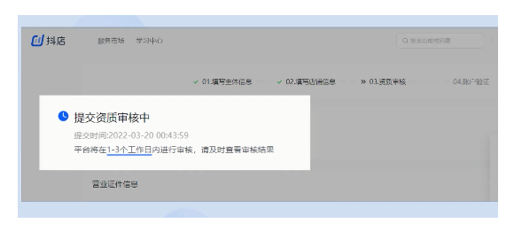 第三步:平臺(tái)進(jìn)行資質(zhì)審核。一般來(lái)說(shuō)資質(zhì)如果沒(méi)有問(wèn)題,10分鐘左右就能通過(guò)審核。
